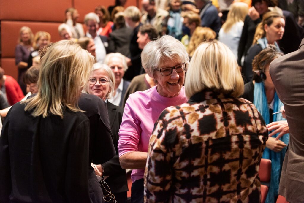Auch das Lachen des Schriftstellers Peter Hoeg, der seit langem ein Mitarbeiter von Helle Jensen ist, das ihn bei seinem Beitrag überkommen hat, nehme ich mit. Denn als er das Publikum bat, sich kurz einmal bei den Sitznachbarn mit Handschlag und Namen vorzustellen, passierte es, dass sich die einander Vorstellenden direkt in Gespräche miteinander vertieft haben. Das hat mich daran erinnert, wenn Kinder nicht das machen, was wir uns vorgestellt haben, wenn wir ihnen einen Auftrag geben. Und uns ärgern. Sein Lachen dabei war so voller Staunen und Herzlichkeit, dass ich sehen konnte, dass wir das, was aus unserem Auftrag entsteht als: „Hey, wie schön ist das denn, die kennen sich kaum und haben sich auf Anhieb soviel zu erzählen?“ sehen können. Als eine Momentaufnahme sehen können und nicht als Scheitern.